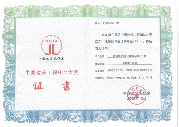 12月29日,首屆中國建設(shè)工程BIM大賽頒獎暨表彰大會在??谂e行,集團兩項成果獲獎,其中“BIM技術(shù)在濟南市唐冶新區(qū)市政工程中的應(yīng)用”獲得二等獎,“順河高架南延項目BIM解決方案”獲得三等獎;另外,“BIM技術(shù)在分離式立交工程中的應(yīng)用——青島長江路與昆侖山路立交”得到書面表彰。